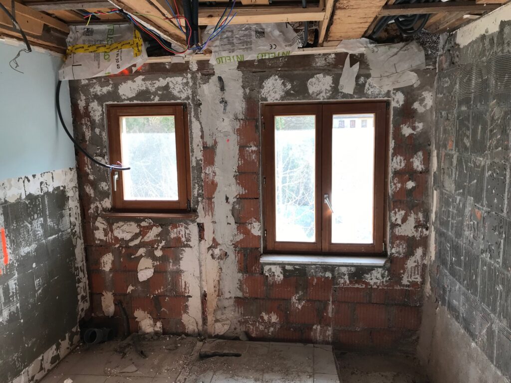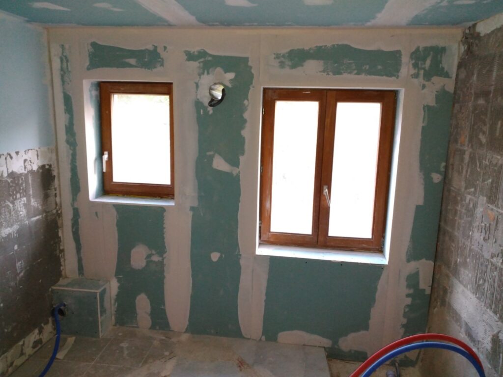 Isolation intérieure d’un mur d’une salle de bain, avec :