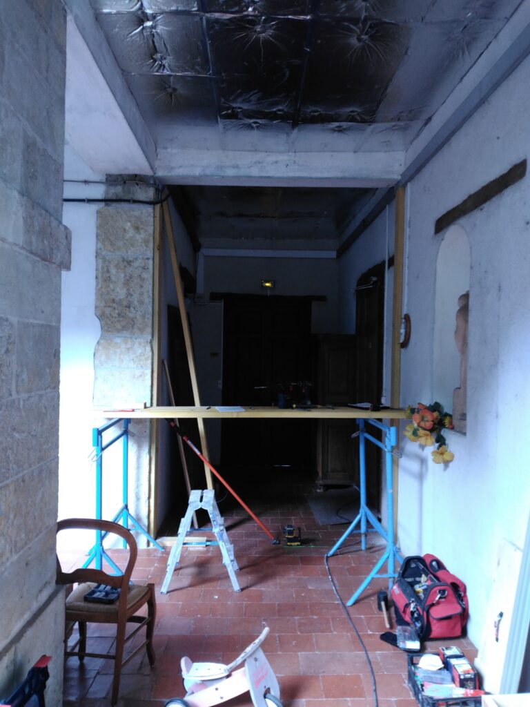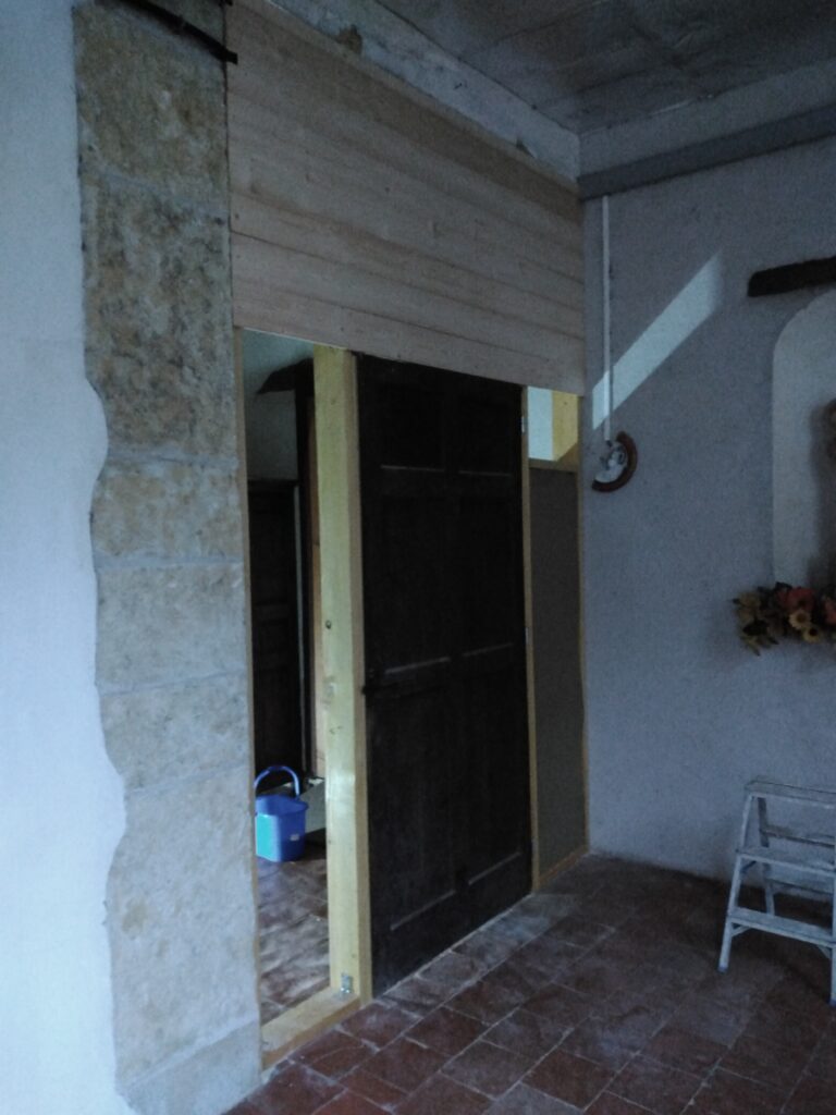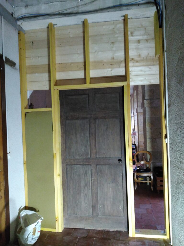 Cloison en ossature bois avec parement bois comprenant l’intégration d’une porte présente à l’origine du bâtiment.