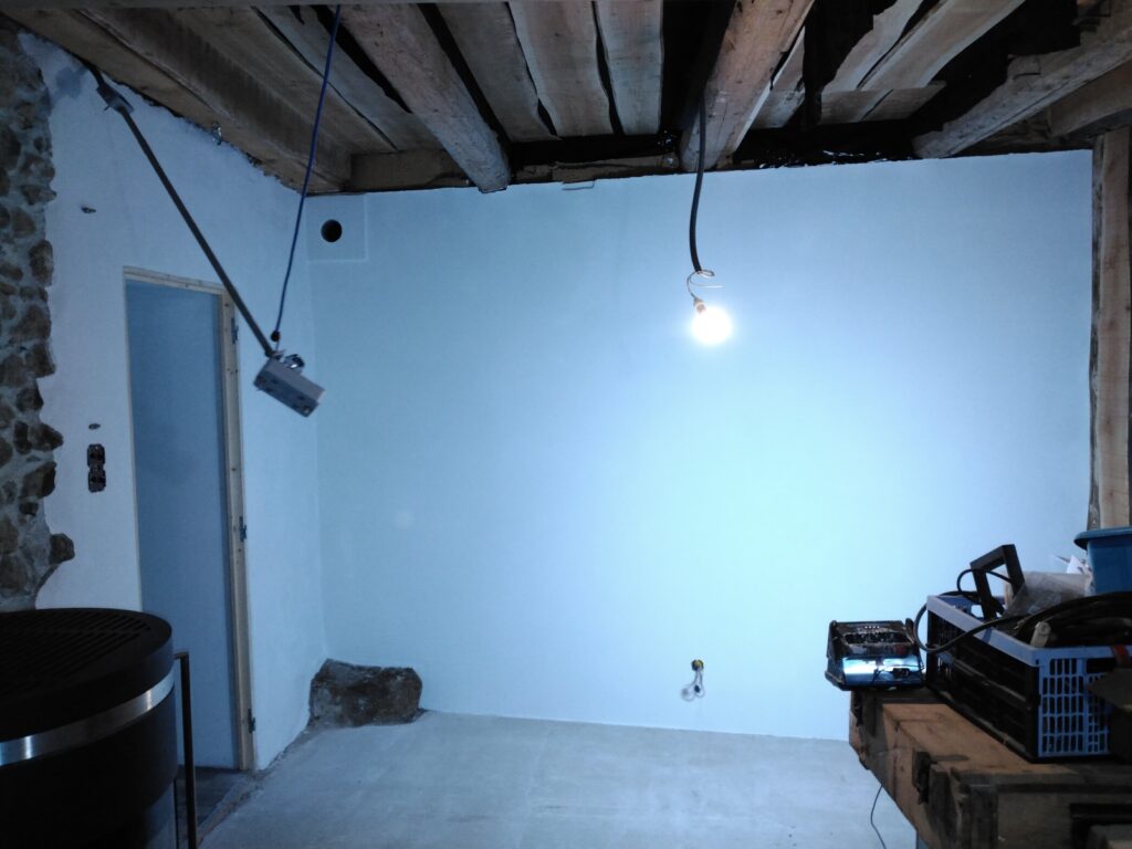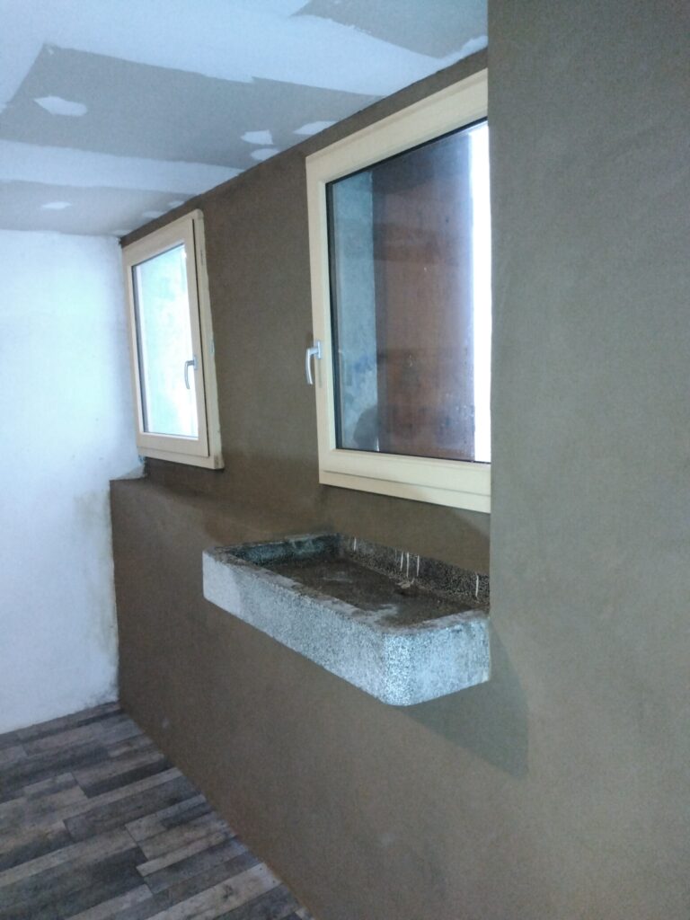 Enduit terre appliqué sur mur en pierre recouvert d’un gobetis béton.
