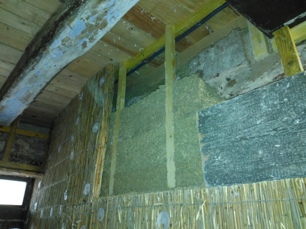 Isolation intérieure en chaux-chanvre banché avec un panneau de roseau.