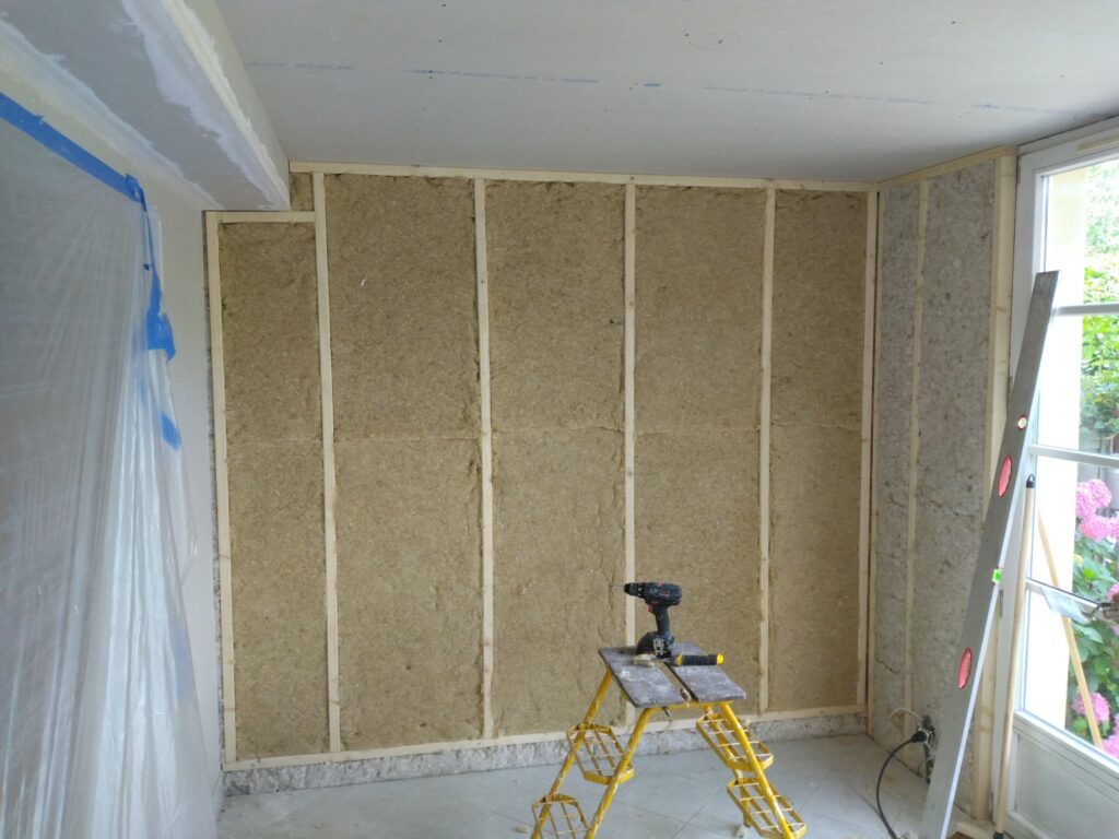 Mise en œuvre d’un doublage plus performant avec un isolant lin/coton/chanvre posé entre ossatures bois et protégé par une membrane pare-vapeur hygrovariable.