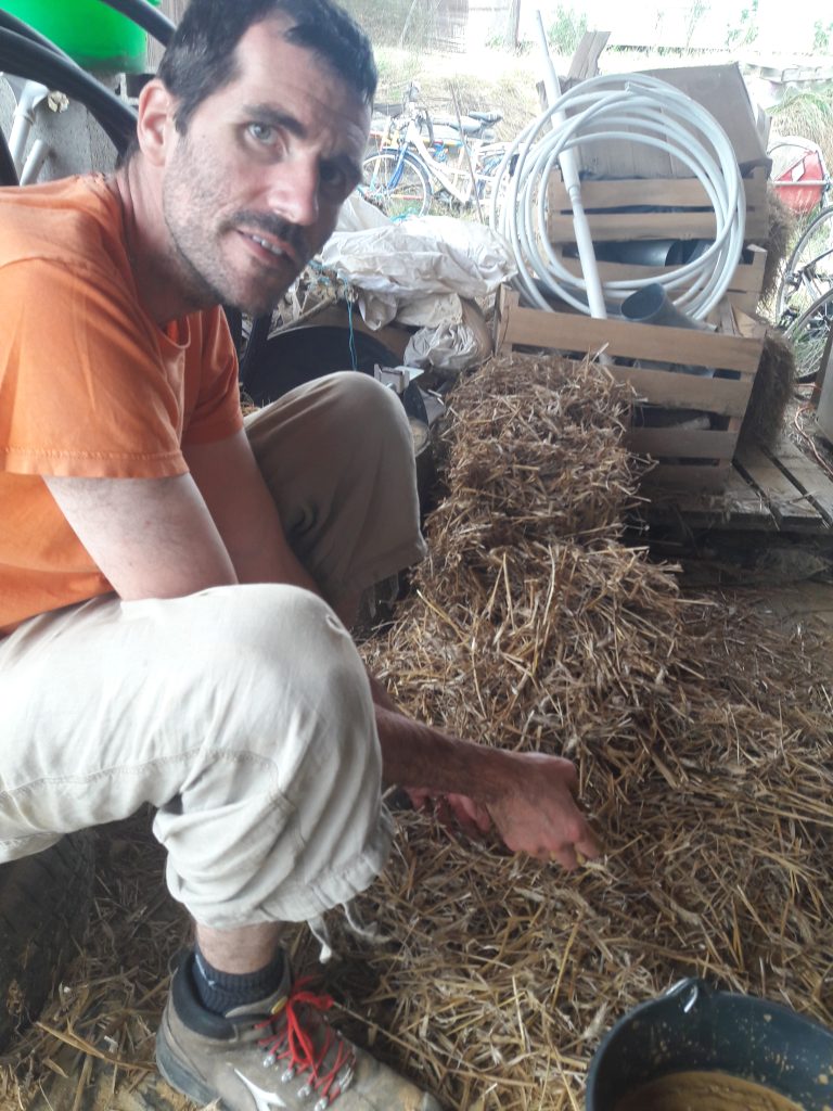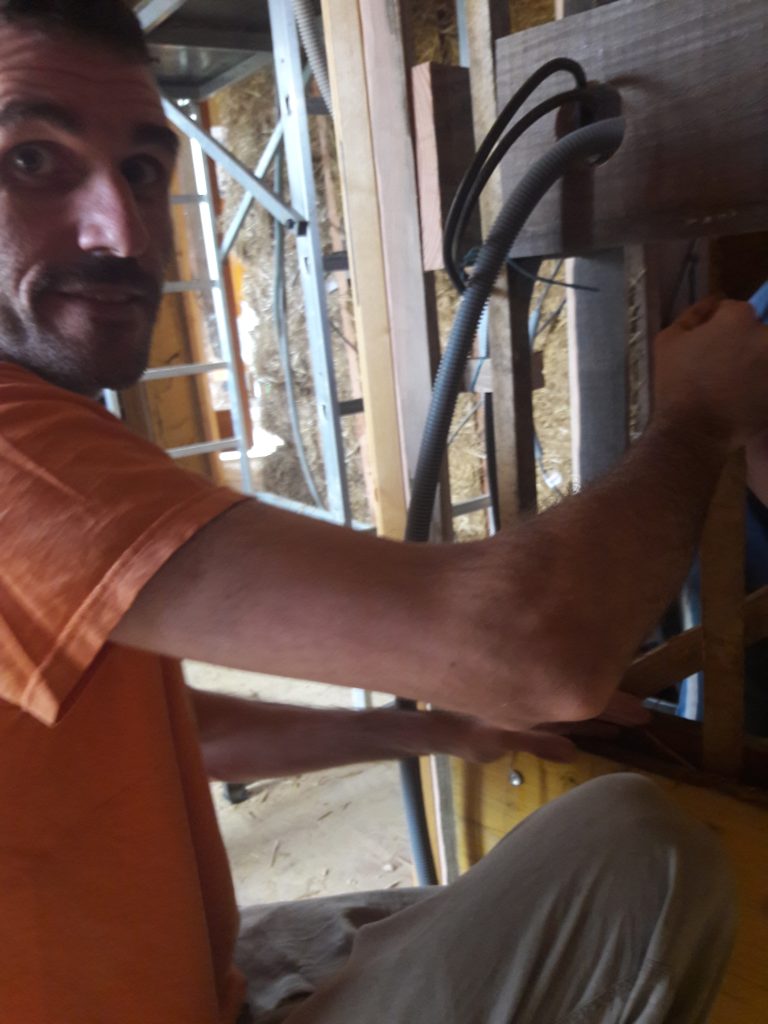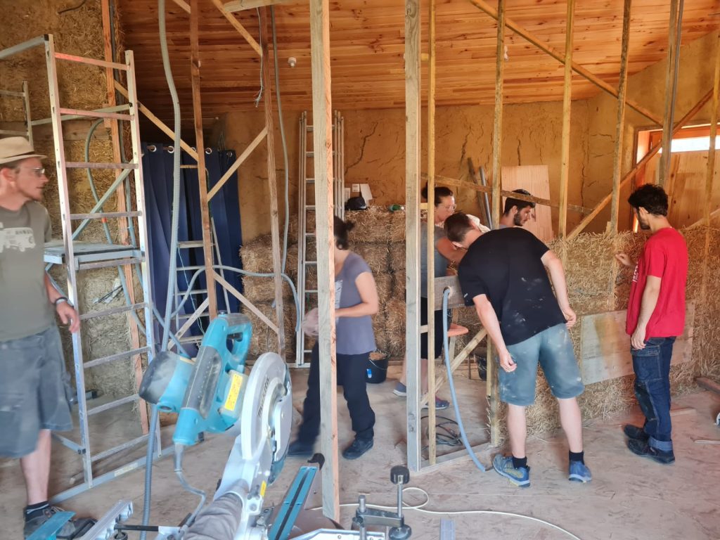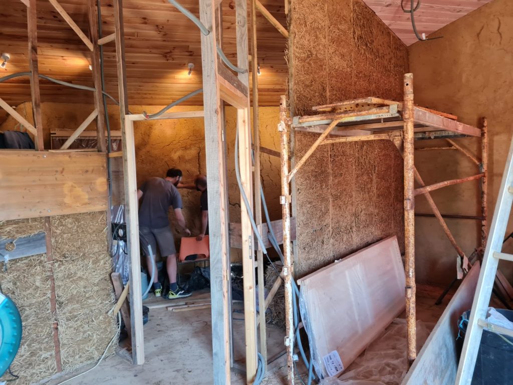 Mise en œuvre d’un mélange terre-paille allégé pour des cloisons intérieures en ossature bois.